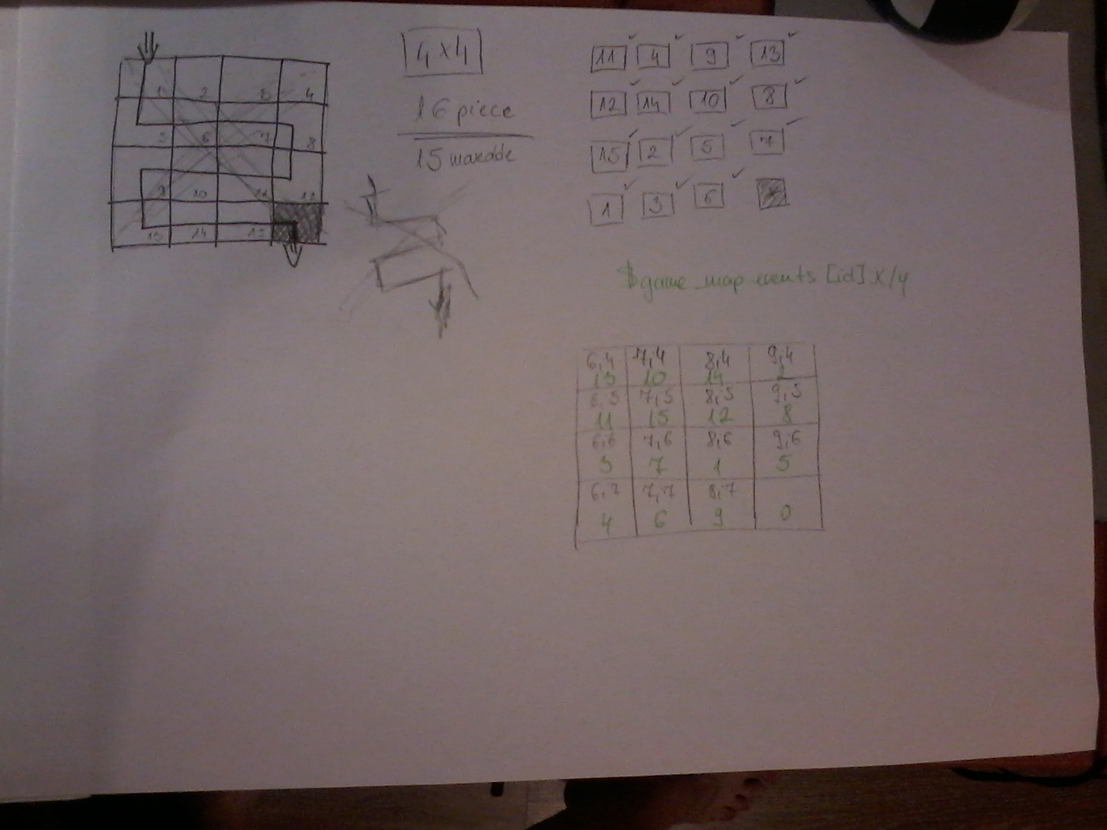 Az els kt kp a tervezi fzist mutatja. Elszedtem a lapokat s szpen levezettem mit akarok kihozni az egsz esemnybl. Egy cssztathats kirakn dolgoztam, biztosan mindenki ltott mr olyat. n imdom ket, szval megprbltam reprodukli egyet ilyen formban. Ehhez pedig elszr is meg kellett csinlni a grafikt, a mozgathat rszekhez, a nem mozgathat rszekhez, stb. Aztn ezt az egsz grafikt sszevgni s betenni a settbe, majd a settet betlteni a programba amiben majd hasznljuk. De itt is figyelni kell logikusan a mretekre, hogy mit hova tesz az ember a setten bell. Belltani, hogy melyik grafikai darab milyen tulajdonsgokkal rendelkezzen, pl t tudjon-e rajta haladni a karakter vagy sem. Ilyen aprsgok. Aztn ha a programban a megfelel trkpen sszerakjuk a kirakt, akkor be kell raknunk mg a darabokat amiket majd mozgatunk. Egy kln esemnyben megrjuk, hogy milyen felttelek mellett melyik darab hova mozogjon. Egyesvel, minden kockra vonatkozan. Ezrt is rajzoltam le s rtam ki azokat a koordintkat, mert ezt mind-mind bele kellett rnom a kdba. Egyszerbb volt csak rnzni a paprra s berni, mint ki-be lpegetni a Database pontbl s egyesvel nzegetni az eventek szmait s a helyzetket. Az utols kp mr a program szerkesztjben kszlt... Ahogy ltszik.