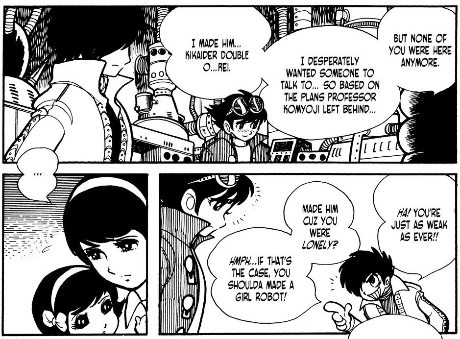Most pedig jjjn az tdik, azaz utols ktet. Ahogy Rieko lelgette Rumit, a kislnyt, gy reztem, hogy megtallta a megfelel Akira ptlkot. Neki mindegy, csak adj egy gyereket a kezbe, aztn lelgeti s vdi ha kell, ha nem. Azrt aranyosak voltak. Mg meg kell emltenem, hogy kiderl kicsoda Rieko valjban. Gill egyik robotja! Ht ki gondolta volna. De most tnyleg. Azt hittem, hogy egy ember. WTF. Lassan az androidok tveszik az irnytst a sorozat felett. Igen, eddig is k voltak a kzppontban, de azrt hinyoznak az emberek. Ja, s ami kicsit ttt, az a cscsbimb lzerek. Tnyleg azok. Sugarakat l a melleibl. Nem tudom mi jrhatott Ishinomori fejben mikor ezt kitallta... Vagy csak gy adta magt a helyzet? Oh, ott van kt mell, mi lenne ha... Hmmm. Nem tudom, tnyleg. Nem igazn tudtam hova tenni ezt. Ennyi ervel a frfi karakterek meg... Nem. Tovbb.