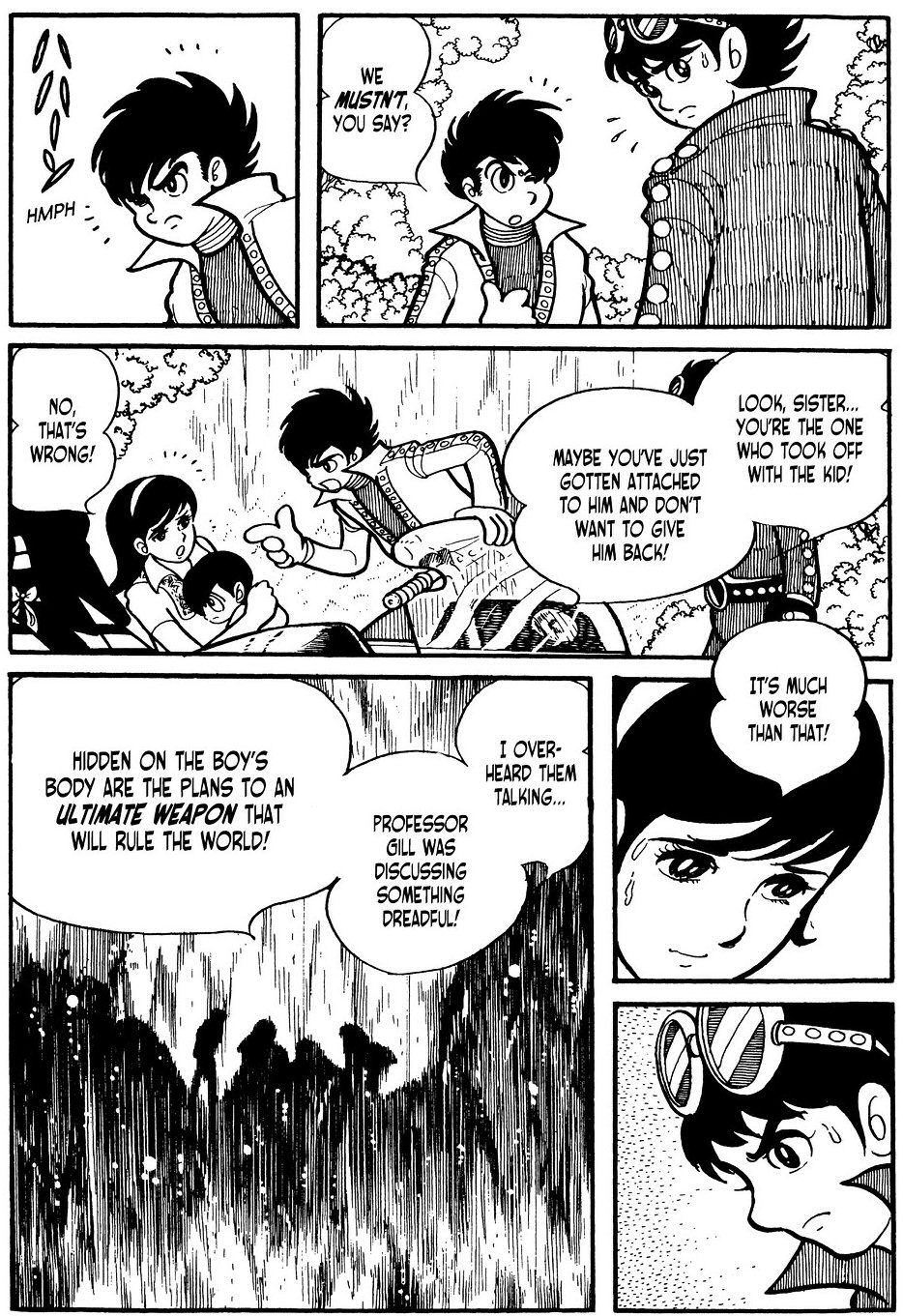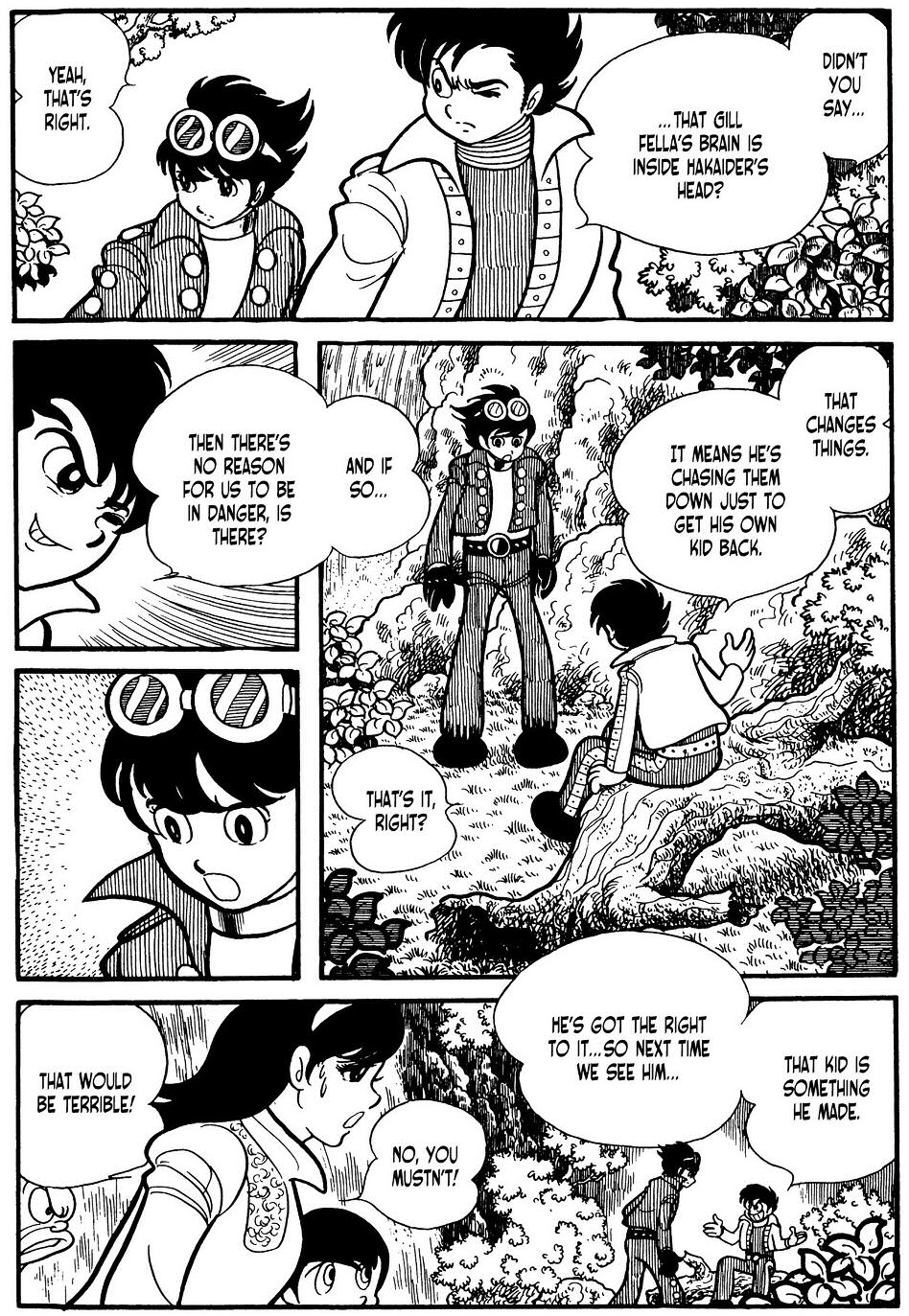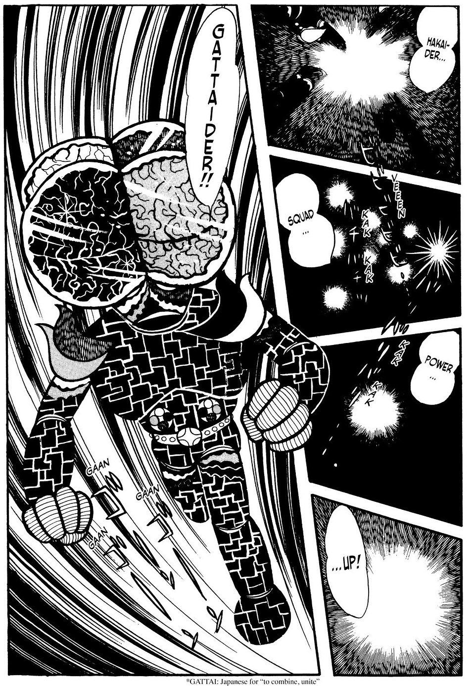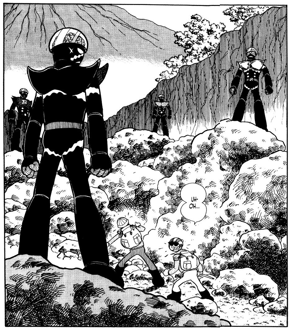 A manga ugyan gy indt, mint az animben lthattuk. Hiba, ez a nyitjelenet verhetetlen. Ktelez. Viszont mr itt is ltunk mdostsokat. Pldul, hogy a labort Green Mantis tmadja meg a Grey Rhino helyett s ebben az esetben Komyoji hagy zenetet Mitsuko szmra mikor ltja, hogy eljttek a Darktl, hogy meglltsk. Mitsuko a katasztrfa utn apja napljban olvas utna annak, hogy mi trtnt Komyoji s Gill kztt. Ez gy elsre olyan sok volt. gy rtem, az animben szpen lassan bontakozott ki a szl, itt meg mindent egybl az ember kpbe vgnak, nesze, emszd meg ezt mind. Arrl nem is beszlve, hogy kicsit rdekes hatst keltett a szmomra, hogy Komyoji vgl is a halott fia, Ichiro miatt kezdett robotokat pteni, aki termszetvdelmi aktivista volt, csak mernyletben meghalt. hm. J, a... termszetvdelem az egy nemes s fontos dolog. Csak kicsit kilg ebbl a trtnetbl most, gy rzem. Mondjuk nem mintha ezen kvl lenne rajta tovbbi hangsly...