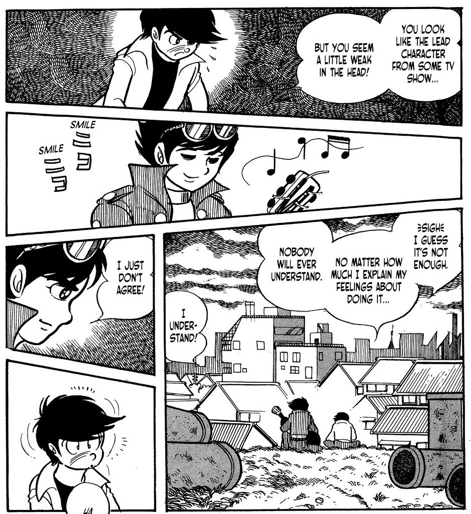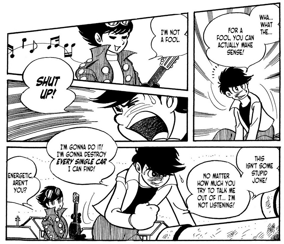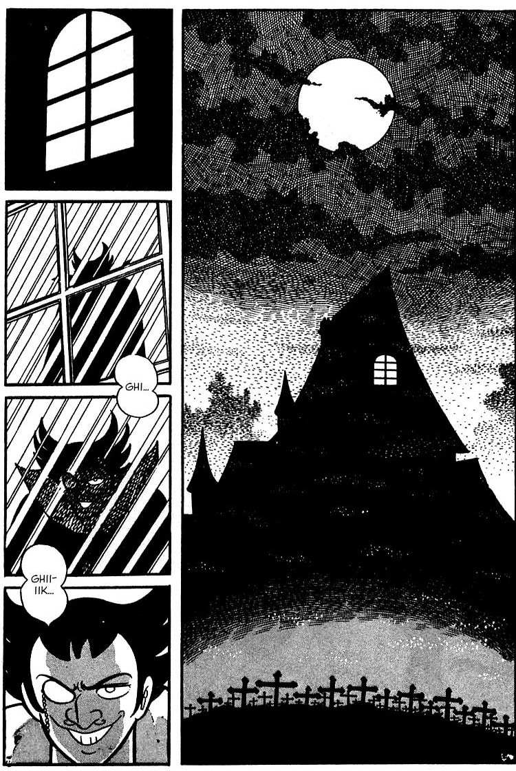 Menjnk sorba. Pldul itt van Hattori s Etsuko karaktere. A mangban csak kt pnzsvr egynrl van sz akiket sehol nem rdekel, hogy mi ez az egsz, csak a pnzket lssk. Ez nem tette ket szmomra els ltsra tl szimpatikuss. Az animben egybl bele lehet szeretni ebbe a prosba, itt viszont... Itt is leginkbb komikus jelenetek kzben vannak jelen, de mgis valahogy nem rzi gy az ember. Szmomra mindent vitt, mikor Hattori a hippi megjelensvel, az 1/2-es mints ingvel felpattant egy kisgyerek bringjra, hogy ldzze Jirot aki... egybknt is motorral volt, de lnyegtelen. Ettl fggetlenl valami elkpeszt lbtechnikja lehetett az regnek, mert nem vesztette szem ell a fit. Mikor a mangt olvastam, gy reztem, hogy Hattori teljesen dilis, totl elmehborodott nha. Hls vagyok, hogy az anime enyhtett ezen s azrt is, hogy Ishinomori is visszavett ebbl a manga ksbbi fejezeteiben.