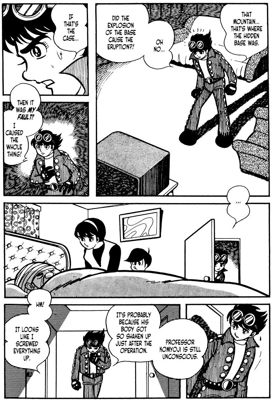 Menjnk tovbb, mert most kezddik csak az igazi izgalom. Jirok elviszik a tbbieket Mitsukokhoz. s most trtnik egy olyan dolog, aminek nem rltem. Mitsuko s Masaru elviszik az apjukat valami klfldi kezelsre, a visszaltetett agya miatt, gy lnyegben ki lesznek rva a trtnetbl. Innentl nem hallunk fellk semmit. Se Hattorirl s Etsukorl. Mintha Ishinomori kicserlte volna az sszes szereplt a fhsn s a fgonoszon kvl. Ez kiss megdbbentett. Elvgre pl Mitsuko nem olyan karakter akinek semmi kze az egszhez aztn akrmikor elkldhetnnk a mangbl. St, pont most, hogy alakult Jiro meg kzte valami... Ez egyszeren... Dobjuk az egszet s nyissunk j karakterekkel? Ishinomori... Ne mr. ppen, hogy megszerettk ezeket a karaktereket. Aztn megint szven szr minket az alkot, mert a mangban most trtnik egy csk Jiro meg Mitsuko kztt elszr. Egy bcs csk. Igen, az anime verziban elbb volt s sokkal nyugodtabb krlmnyek kztt. Ez gy szomor.